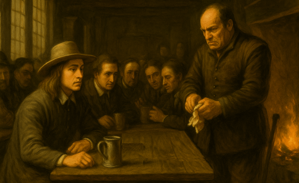 Humanity being what it is, the seating had sorted itself as it always does. At the fire’s end clustered the high-wigged sons of the wealthy, alongside the more powerful merchants, politicians, and guild leaders; their ledgers spread beside steaming cups. Nearer the door, messengers and small tradesmen bent over shared news-sheets, their fingers still scented of ink or tallow. Between these two poles ran the overlapping hum of gossip and Parliament talk, undercut by the metallic scrape of spoons in pewter mugs. As George Whitehead entered, a merchant’s laugh rang too loud, only to be swallowed at once by the low, serious murmur of political debate.