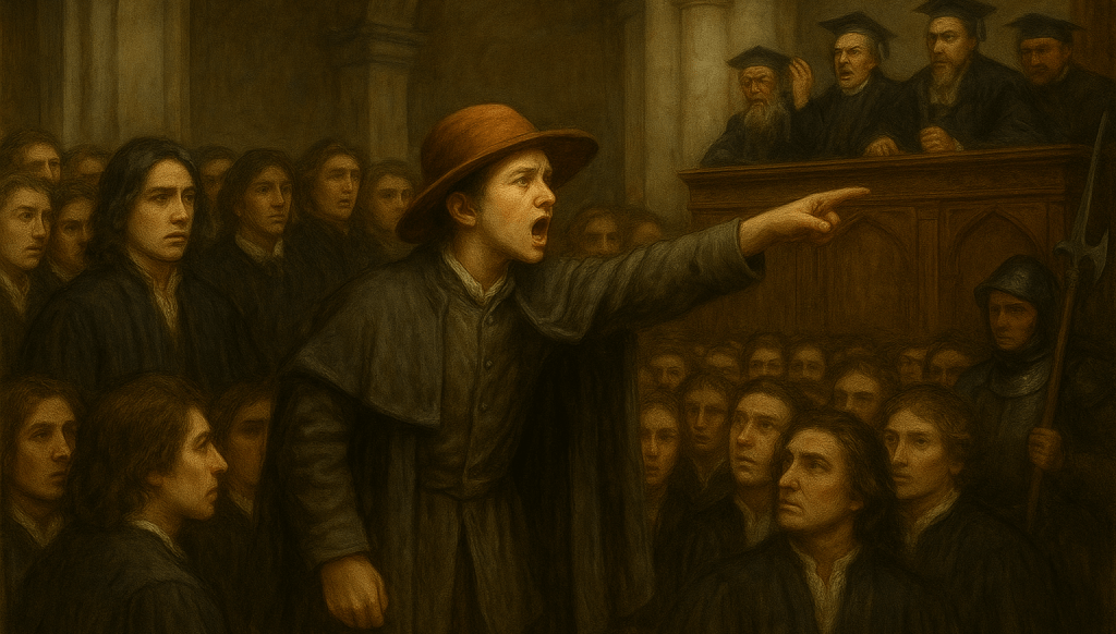 Tom stepped forward, trembling but fierce. He knew all the words to say, whispered at many a midnight fireside among the Friends. “Thou art no shepherds but hirelings! And the Scriptures are no more the Word of God than your robes are holiness!”