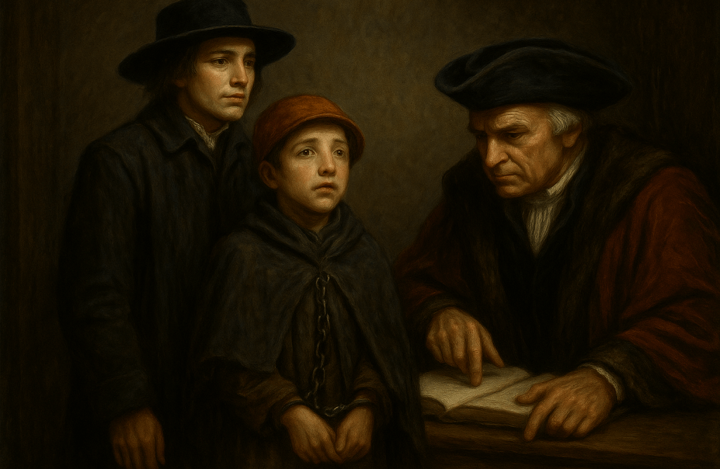 There was a gasp, barely audible, near the back of the room. Bess had slipped in quietly, heart hammering, and now clasped her apron in white-knuckled fists. Her face was pale, jaw clenched, eyes puddled with tears as she watched the child she had let slip from her grasp now cringing under the weight of the law. She dared not speak—to do so would only worsen his fate—but her eyes never left him.