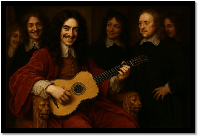 Even now they busied themselves with a parody of industry—arranging papers, playing with pens—as though the trappings of office might be mistaken for its substance. Claythorpe, meanwhile, tended the royal guitar with an almost priestly solemnity, having eased it into a case newly lined with velvet, no less sumptuous than the fabric adorning the King’s back.